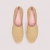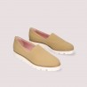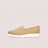 Our Charlize, a loafer with elevated light weigh sole in elastic tan fabric.