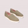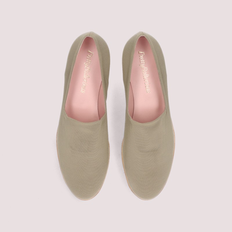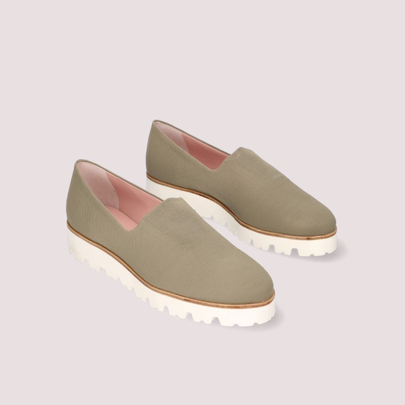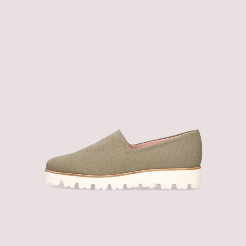 Charlize, the light lifted sole loafer in elastic cool fabric. Khaki. For the travelers and walkers.