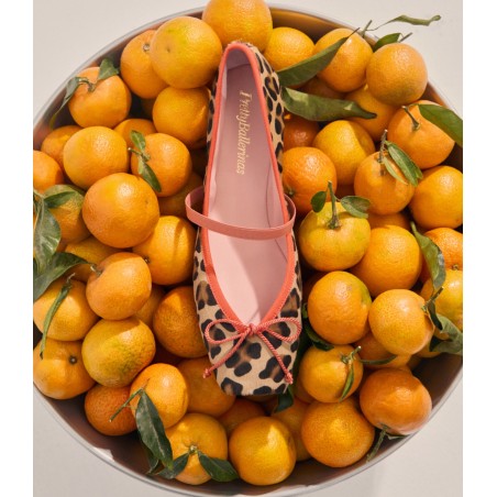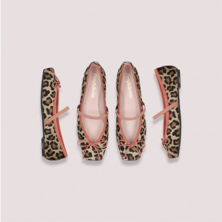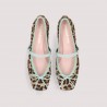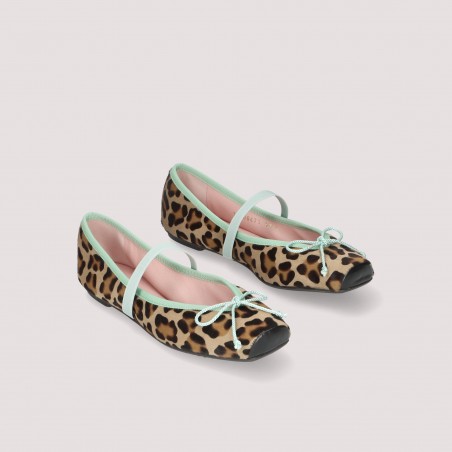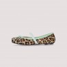 Mary Jane Sacchetto style ballerina Kristen in soft leopard print leather with aqua trim and bow, featuring elastic strap detail. Leather sole, insole and lining. Unlike traditional shoe construction, Sacchetto involves stitching the inner lining directly to the sole, eliminating the need for insoles and providing a glove-like fit. This technique ensures maximum flexibility and comfort, allowing the shoe to adapt to the foot's natural movements. The result is a sophisticated and luxurious footwear experience that seamlessly blends style and comfort in every step. . Runs small, we suggest you to buy 1/2 size up