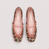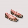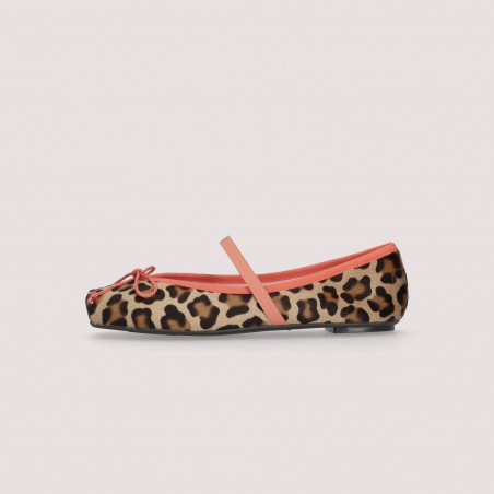 Mary Jane Sacchetto style ballerina Kristen in soft leopard print leather with coral trim and bow, featuring elastic strap detail. Leather sole, insole and lining. Unlike traditional shoe construction, Sacchetto involves stitching the inner lining directly to the sole, eliminating the need for insoles and providing a glove-like fit. This technique ensures maximum flexibility and comfort, allowing the shoe to adapt to the foot's natural movements. The result is a sophisticated and luxurious footwear experience that seamlessly blends style and comfort in every step. . Runs small, we suggest you to buy 1/2 size up