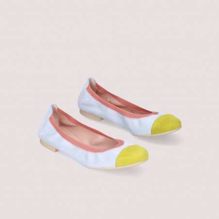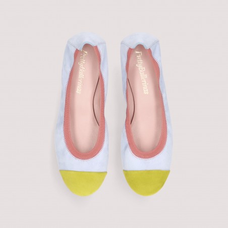 Bended ballerinas Shirley in soft baby blue leather, with green lime suede toe and coral elastic. Rubber soles. . Runs small, we suggest you to buy 1/2 size up