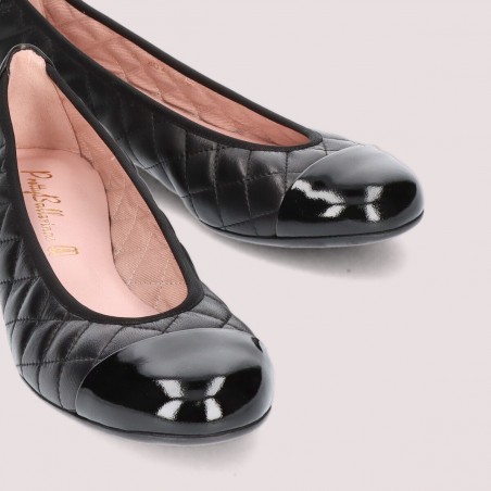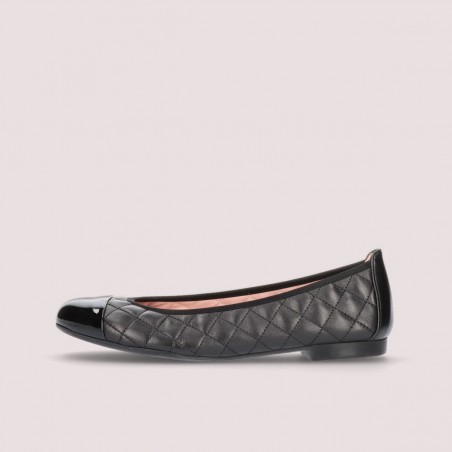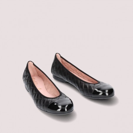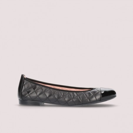 Bendy ballerina with a flexible rubber sole. Quilted black leather with black patent toe. . Runs small, we suggest you to buy 1/2 size up