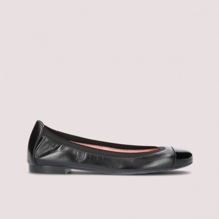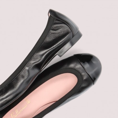 Bendy ballerina with a flexible rubber sole. Black soft leather with black patent toe cap. . Runs small, we suggest you to buy 1/2 size up