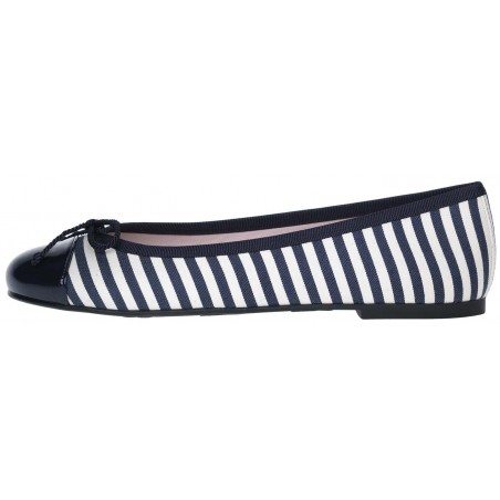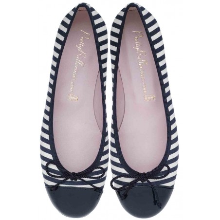 Stripey nautical textile with navy blue patent toe, leather insole and lining, and black rubber sole