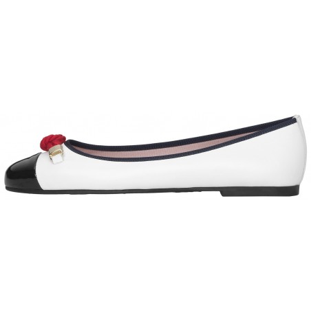 Soft white leather with navy blue patent toe and nautical rope detail. Rubber sole, leather insole and textile lining