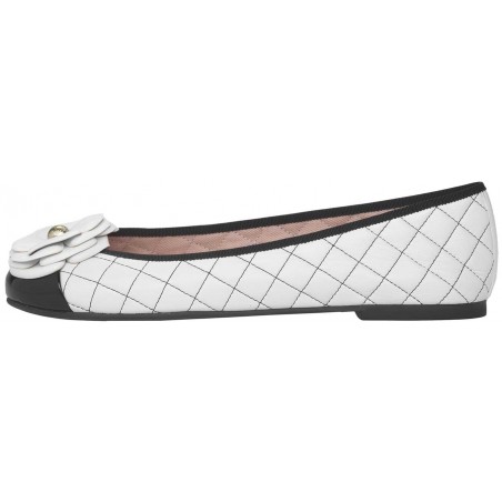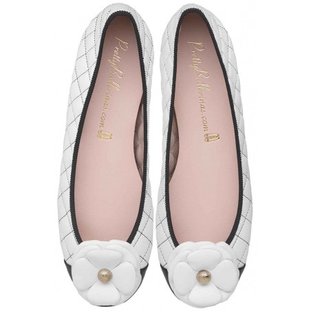 White quilted leather with flower detail and black patent leather toe, rubber sole, leather insole and lining
