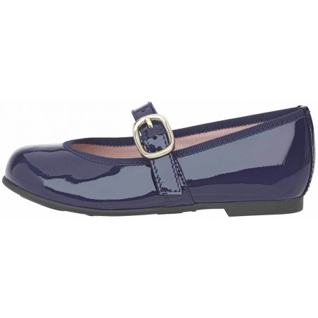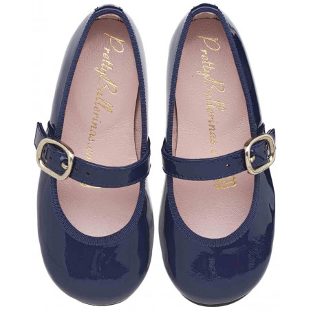 Shiny navy blue patent leather with strap detail, rubber sole, leather insole and textile lining