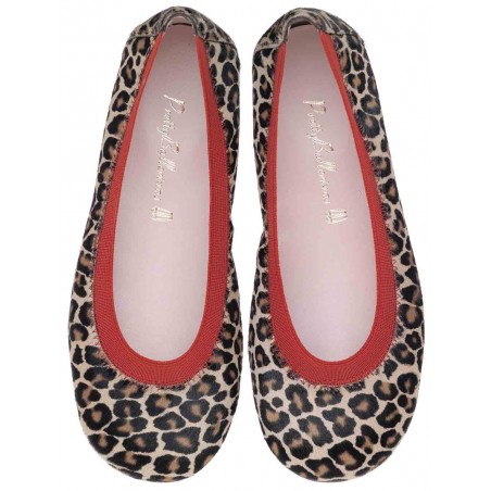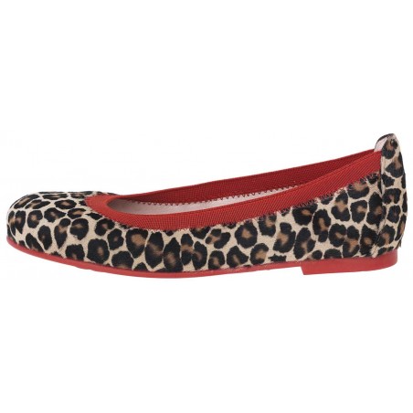 Small leopard printed poni with red elastic trim, leather lining and insole and red rubber sole