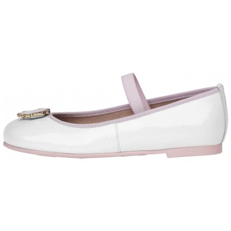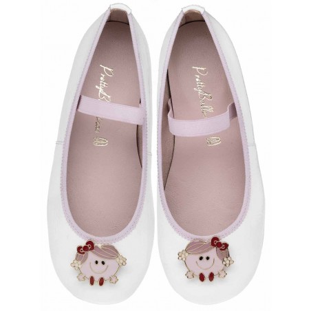 A flat ballerina with a round toe and elastic to keep on the foot