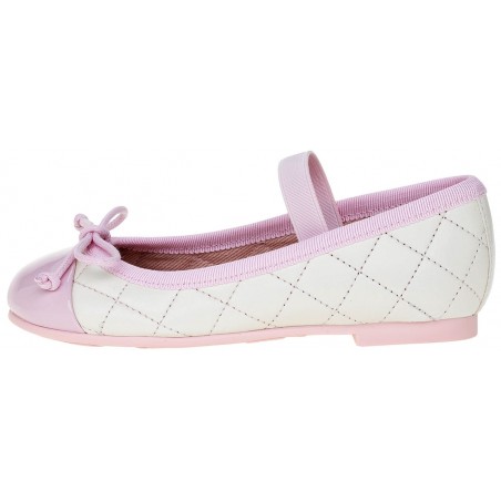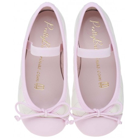 Ivory quilted leather with pink patent leather toe, rubber sole, leather insole and textile lining