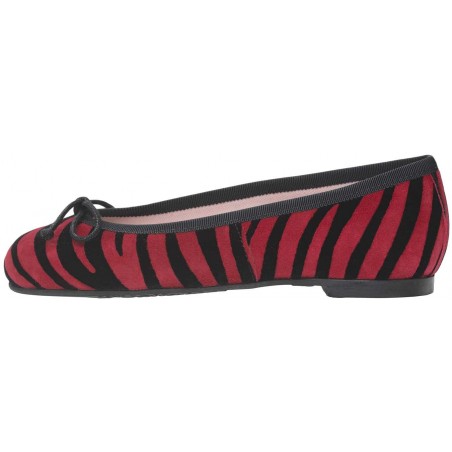 Red and black zebra printed suede with rubber sole, leather insole and textile lining