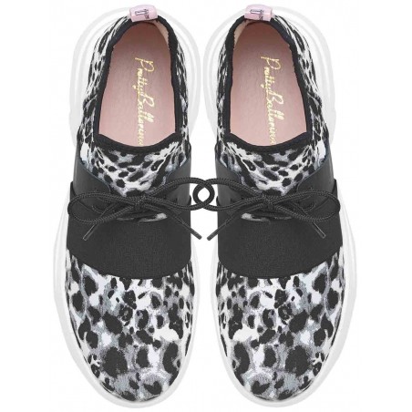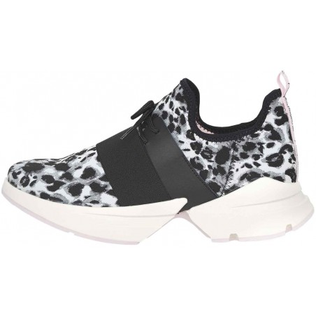 Elasticated animal printed textile in black and white with black elastic, rubber sole, leather insole and textile lining