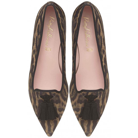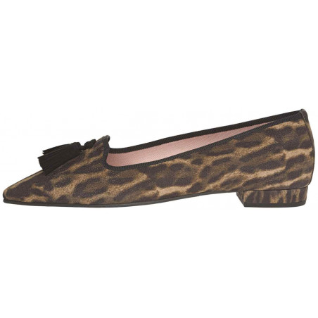 Soft animal printed suede with black suede tassels, rubber sole, leather insole and textile lining