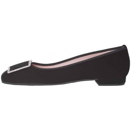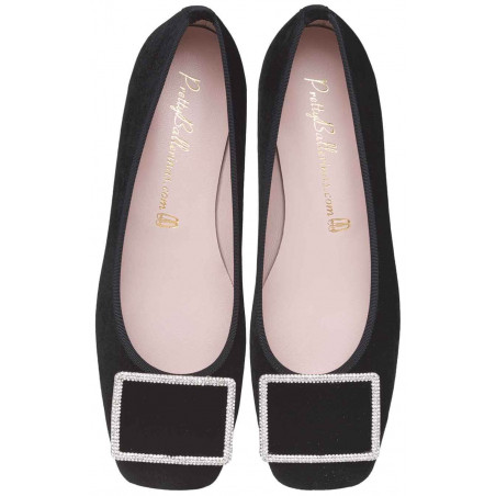Soft black velvet with crystal buckle detail, rubber sole, leather insole and lining
