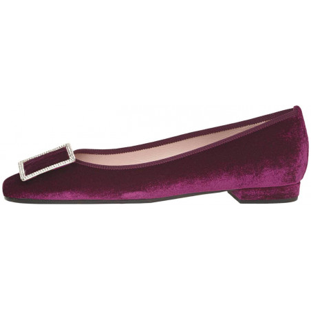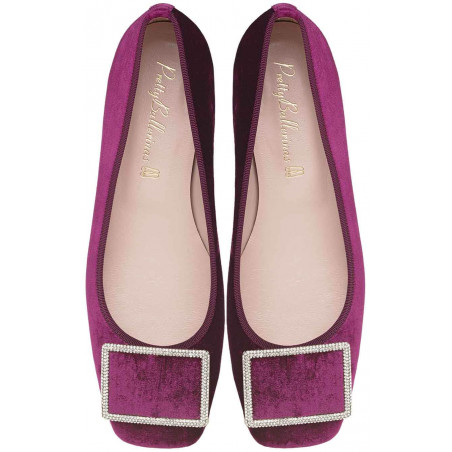 Fuchsia velvet with crystal buckle detail, rubber sole, leather insole and lining