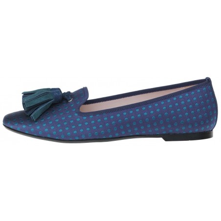 Blue and teal textile with matching suede tassels, rubber sole, leather insole and lining
