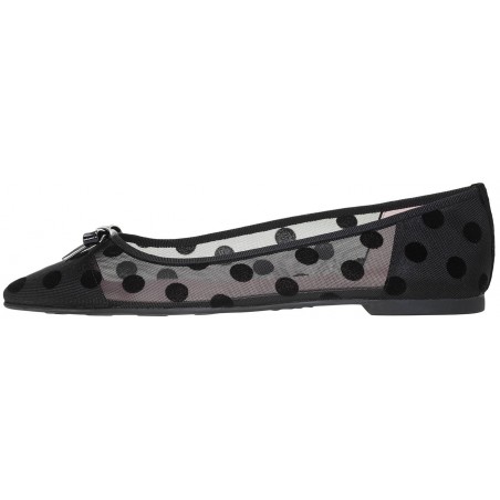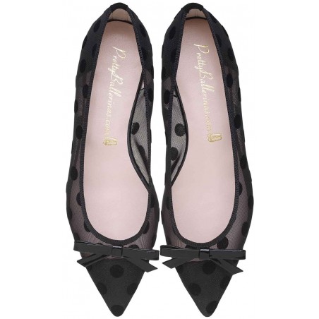 Black mesh with polka dots and black patent leather bow, rubber sole, leather insole and lining