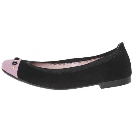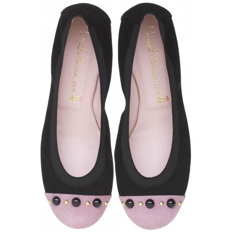 Soft black suede with pink suede toe, rubber sole, leather insole and lining