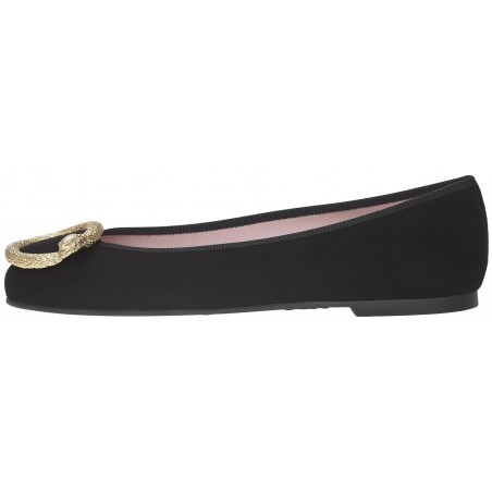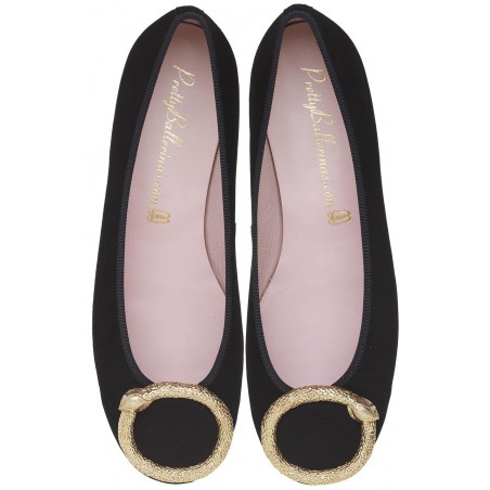 Soft black suede with golden snake buckle, rubber sole, leather insole and textile lining